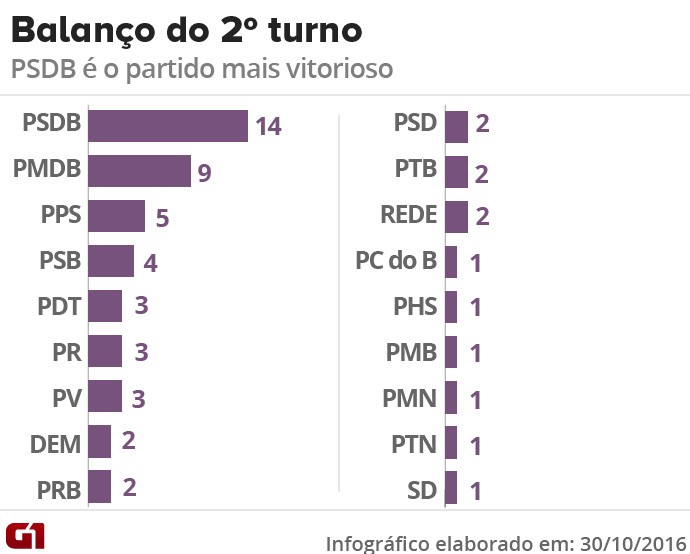 Das consideradas grandes legendas em atuação no país, o PSDB apresentou-se como melhor desempenho. Os tucanos já haviam se destacado no primeiro turno das eleições no grupo das capitais e cidades com mais de 200 mil eleitores. Obteve 14 eleitos. O mesmo número se repetiu neste domingo e, agora, o partido irá governar 28 grandes cidades a partir de janeiro de 2017.