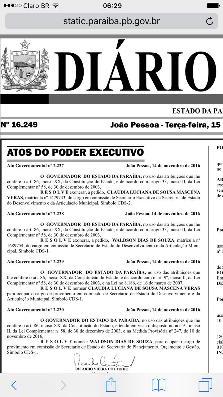 Em meio às mudanças na equipe de auxiliares do Palácio da Redenção, o governador Ricardo Coutinho (PSB) levou os nomes de Waldson Sousa e Cláudio Veras a edição do Diário Oficial desta terça-feira (15). Foi publicado o ato de nomeação deles nos postos de secretário de Desenvolvimento de Articulação Municipal e Planejamento, Orçamento e Gestão, respectivamente.