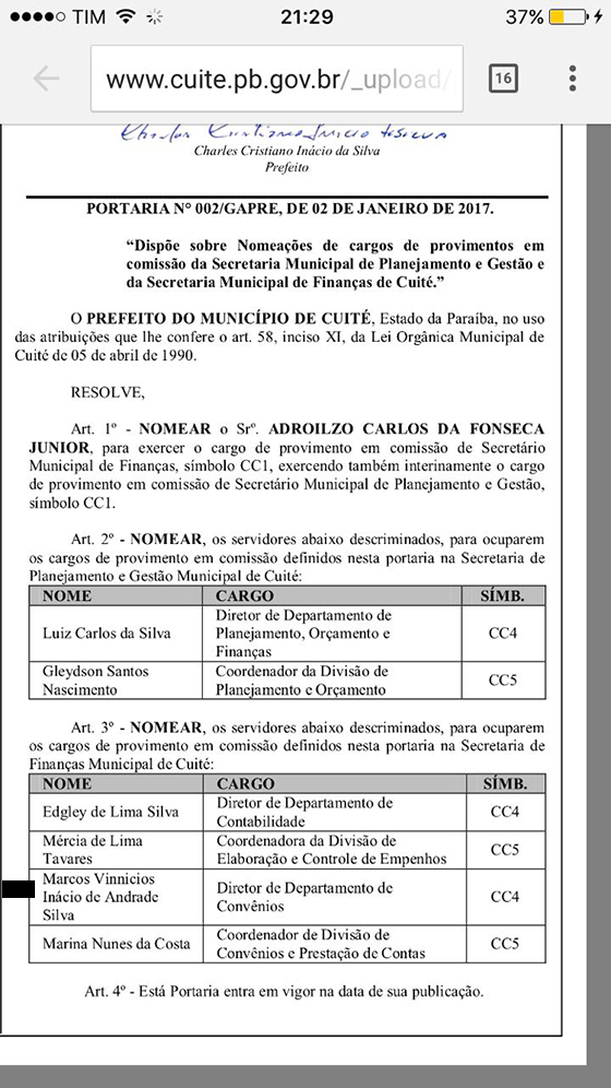 Pois bem. O ex-vereador ostentação acaba de ser nomeado diretor do Departamento de Convênios de Cuité, cidade onde foi vereador. A nomeação aconteceu por uma deferência do prefeito local Charles Cristiano Inácio da Silva, mas conhecido por Chaves Camaraense, ex-suplente de deputado estadual.